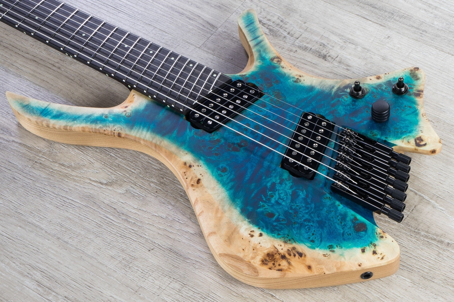 New Skervesen Shoggie 7 FF Headless Multiscale 7-String Electric Guitar, Poplar Burl Top, Hard Case - Silver Blue Fade